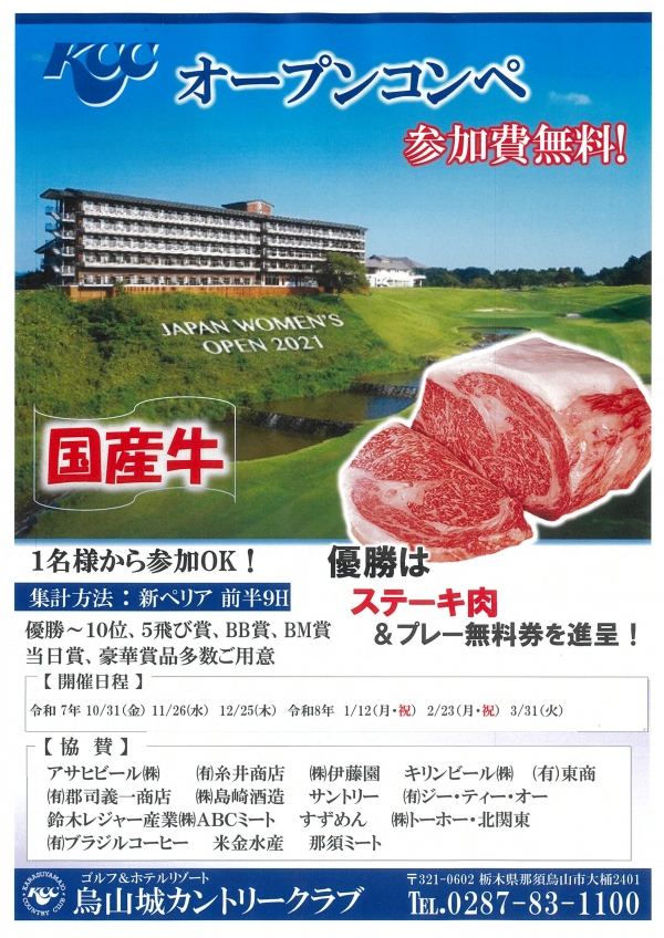参加費無料!! 集計方法:新ペリア・前半9H集計 1名様から参加可 【開催日】 11/26(水) 12/25(木) 1/12(月祝) 2/23(月祝) 3/31(火) 【賞 品】 優勝者には 国産牛ステーキ肉&プレー無料券を進呈! 他、豪華賞品を多数ご用意しております。 (優勝〜10位・5飛び賞・当日賞・BB賞・BM賞) |